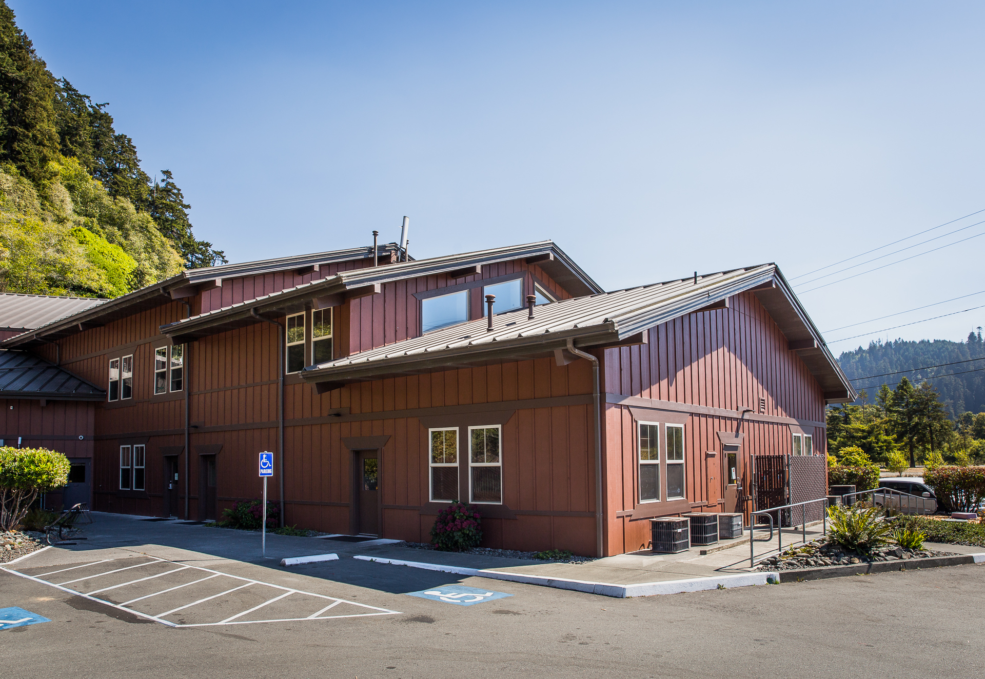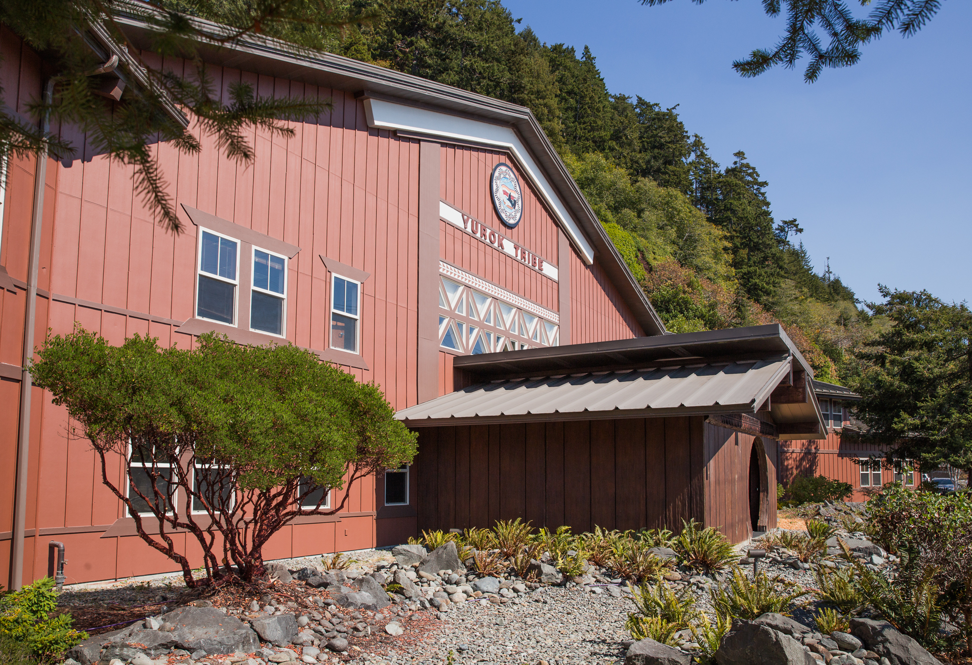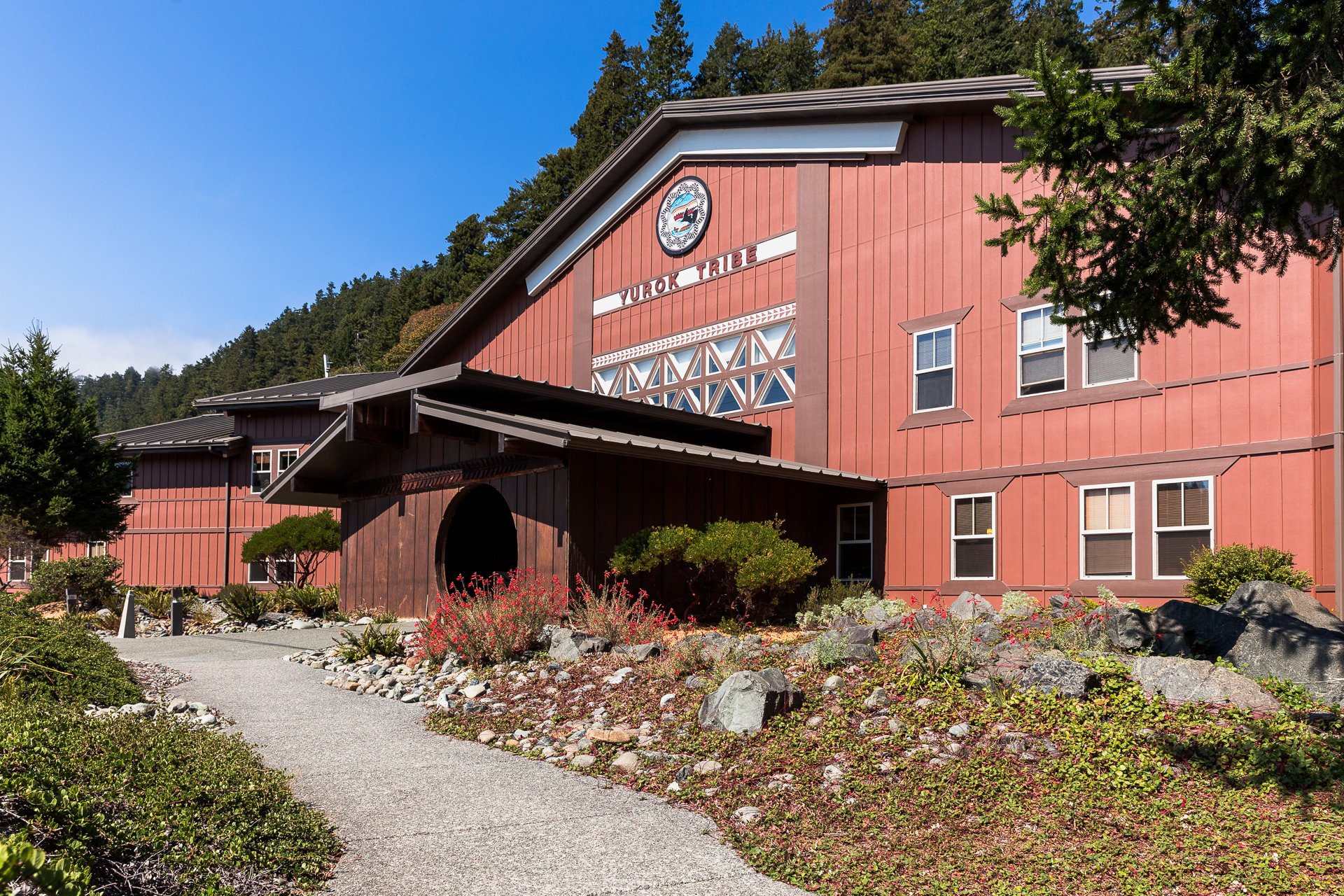 There was a conscious effort by all parties to build an environmentally sound structure. To accomplish this goal, most of the building (including the framing) is constructed using metal, a heavily recycled product. The unique entry is based on the traditional living structures of the Yurok tribe. It is fabricated from pre-cast concrete panels textured to look like the split logs used in traditional Yurok homes.